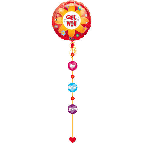 Send a thoughtful message with our 32" Get Well Drop A Line Foil Balloon! Features a round foil balloon with flowers and the message "Get Well". This also includes a ribbon with cutouts that say "Feel Better Soon" and a weight. Ships flat and can be inflated with air or helium. Measures 32" X 90". Includes 1 foil balloon with ribbon per package.