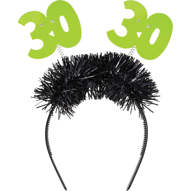 Get in the birthday spirit with our Age 30 Flashing Headband! Features a black plastic headband with black tinsel and flashing green "30" headboppers. One size fits most. Includes 1 headband per package.