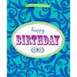 Send a gift to a friend or family member with this Birthday Scroll Medium Gift Bag! Features a turquoise and blue scroll work design background with "Happy Birthday" printed in a white circle. Includes green ribbon handles. Measures 9.25" x 7.75". Includes 1 per package.