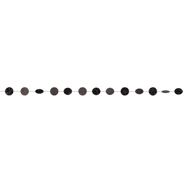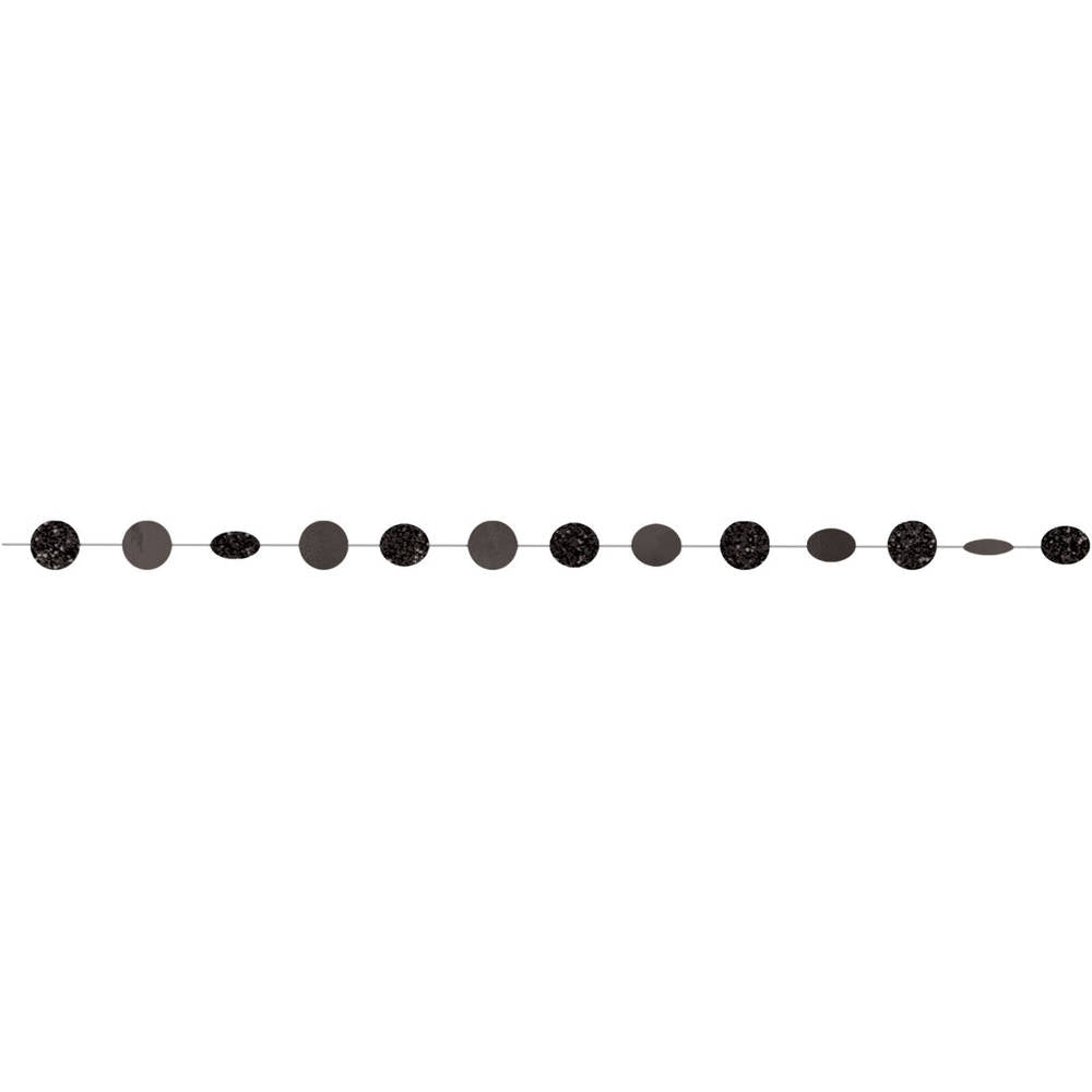 Decorate any celebration with our Black Round Glitter String Garlands! Each package features black glitter foil cutouts strung together. Measures 7 feet. Includes 6 string garlands per package.