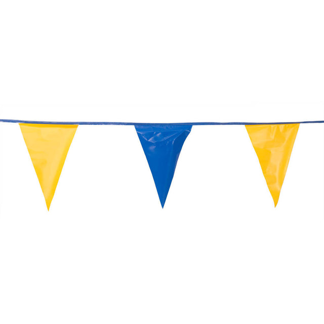 Our blue and yellow triangle pennant flags are a great way to attract attention to your event. They can easily be strung from poles, trees, or other tall objects. Made of heavy-duty plastic. Each Flag measures 12"x 18"" on a 100 ft. Line (48 Flags Per Line)