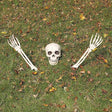 Create a chilling scene in your yard with this Buried Alive Skeleton Parts Set! Complete with 2 skeletal arms (14" long each) and 1 realistic skull (7.5" x 5.5" x 6"), this durable all-weather plastic decoration is built to withstand outdoor conditions. Easy to set up by simply pushing the stakes into the ground, it’s the perfect addition to Halloween yard displays, haunted graveyards, or any spooky outdoor setup. One skull and two arms per package.