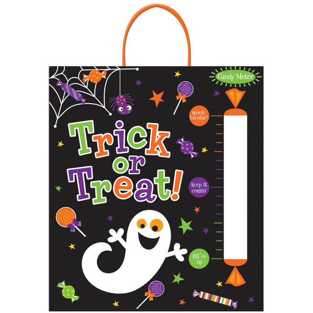 Collect your Halloween candy in our Candy Meter Deluxe Trick or Treat Bag! Each bag features orange plastic handles with candy, spiders, spiderwebs, ghosts, and the message "Trick or Treat". Made of plastic. Measures 16" x 14". Includes 1 bag per package.