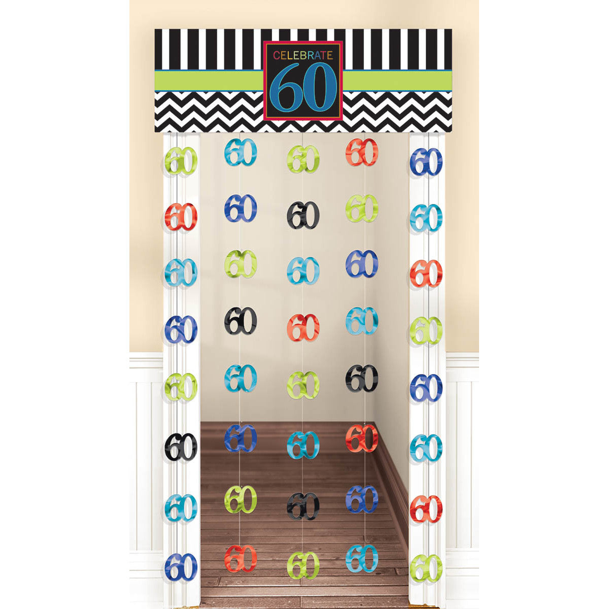 Add some color to your 60th birthday celebration with this Doorway Curtain. Curtain features a 39 inch chevron and striped banner with dangling "60" cutouts in assorted colors. Curtain measures 77 inches long and 39 inches wide. Includes 1 curtain per package.