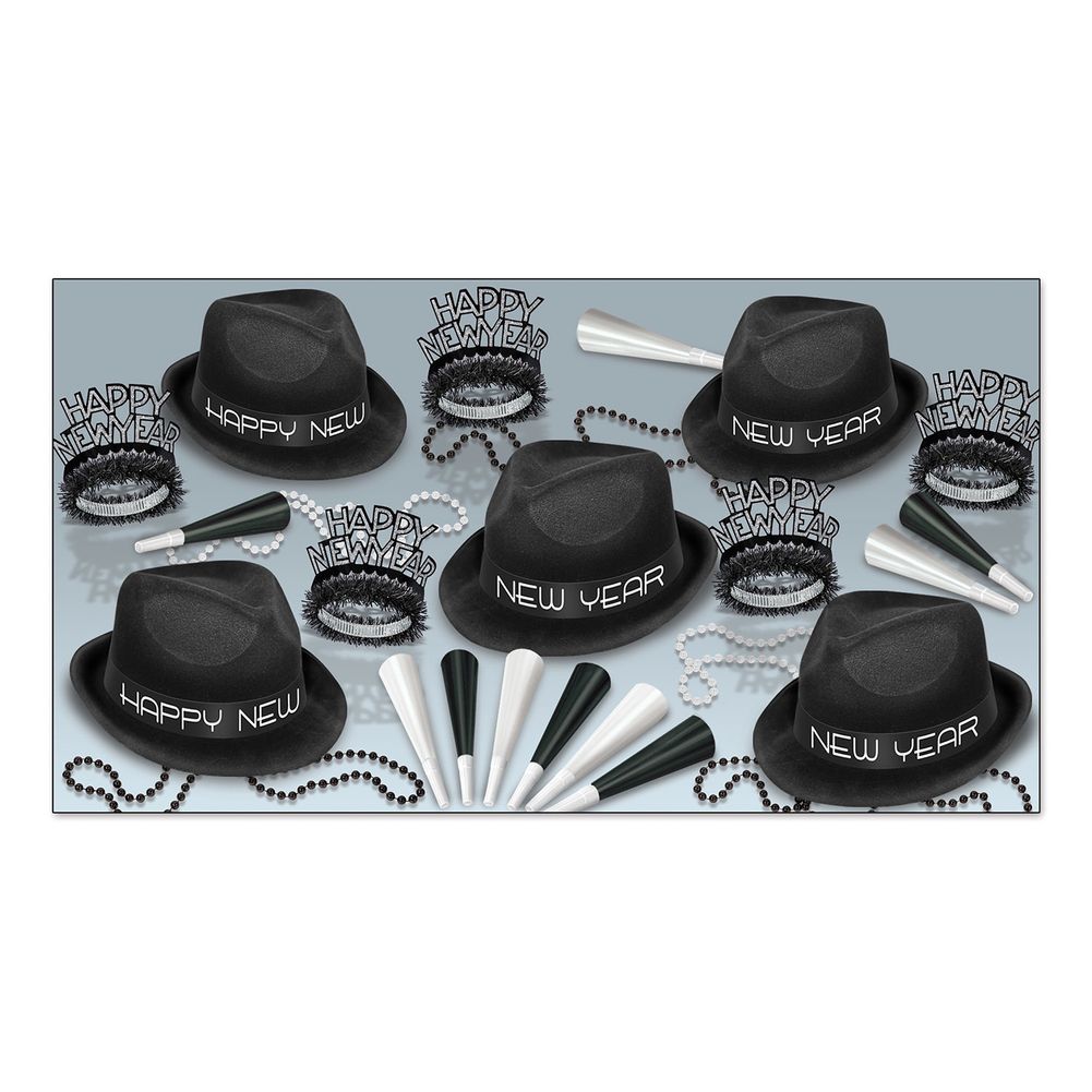 Dress up the whole gang with our Chairman Silver New Years Party Assortment! Each assortment includes 5 plastic velour fedoras, 5 tiaras, 10 foil horns, and 5 party bead necklaces. All party accessories feature a black, silver, and white color scheme. One size fits most adults. Made of plastic and heavy duty cardstock. Total of 25 items per package.