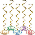 Spread words of holiday cheer with our Christmas Word Whirls. The whirls are metallic gold and features a cardstock sign attached to the end of each one. The signs read: believe, love, faith, hope and joy. Measures 3' 4''. 5 swirls are included per package.