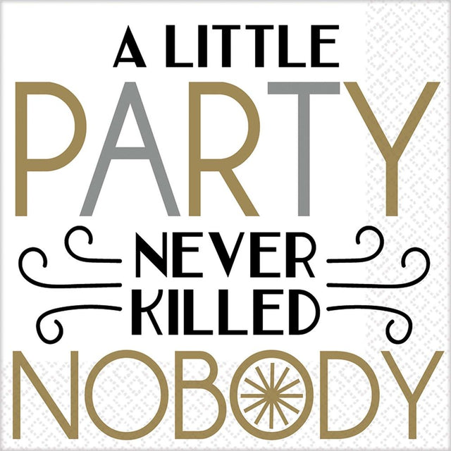 Add our Dapper Night Luncheon Napkins to your holiday tables! Features the message "A Little Party Never Killed Nobody". Measures 6.5" x 6.5". Includes 36 - 2 ply paper napkins per package.