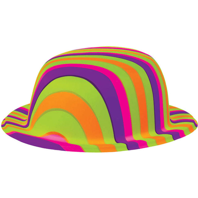 Get ready to party like its the 1960's again with this psychedelic Feeling Groovy Rainbow Stripes Plastic Bowler Hat! The hat is made of light weight plastic and decorated with green, orange, purple and pink horizontal stripes. One size fits most. 1 included per package.