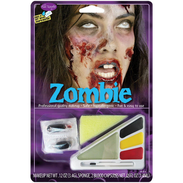 Complete you zombie costume with our Female Zombie Character Makeup Kit! Each kit includes: blood capsules, makeup sponge, makeup brush, and cream makeup palette. Includes 1 kit per package.