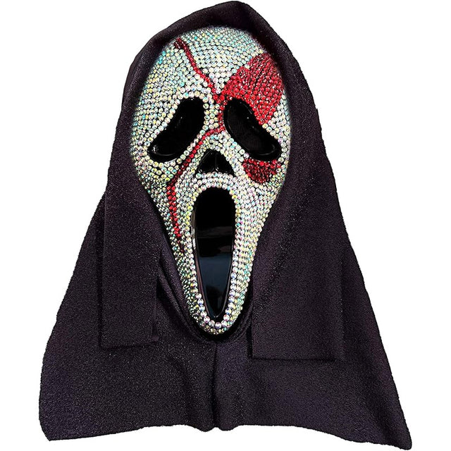 Complete your chilling look with the Ghost Face® Bloody Bling Mask! Covered in sparkling clear rhinestones with a striking section of red rhinestones to mimic a gory wound, this mask delivers both glam and gore in one haunting accessory. The attached black fabric shroud adds an eerie finishing touch, making it easy to pair with a black robe for an instant, spine-tingling costume. Officially licensed and crafted for unforgettable scares, this Ghost Face® mask is perfect for trick-or-treating, theme parties, or any Halloween event. One Ghost Face® Bloody Bling Mask per package.