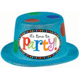 Get your party on wearing our Glitter Top Hat! This fun and festive hat features a glittery teal design with colorful polka dots and the message "It's Time to Party!" on the front. One size fits most adults and teenagers. 1 Glitter Dot Top Hat is included per package.