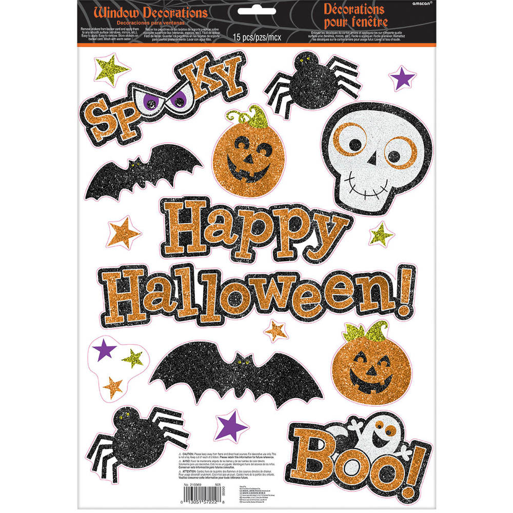 Decorate for the friendliest of ghouls with our Family Friendly Glitter Halloween Window Cling! Features friendly Jack-O-Lanterns, ghosts, bats, an owl, a witch, and more! Clings will stick to most clean, dry, and non-porous surfaces. Not recommended for vehicles. Includes 1 sheet with 15 clings per package.