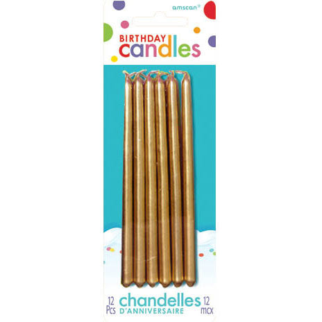 Top off your birthday cake with these beautiful Gold Mini Tapers. These 5" long candles add a simple shimmer to any cake. 12 candles per package.