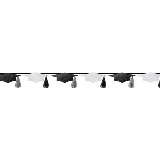 Grad Cap Tassel Banner White. Glitter cardstock and foil. Measures 12'x6". 1 per package.