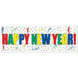 This Happy New Year Banner is a great decoration for your New Year's Eve party! This large sign banner features bright colorful block letters that say "Happy New Year". Colorful confetti and serpentine complete the look. Made of plastic. Great for indoor or outdoor use. This item comes 1 per package. Measures 21" by 5'.