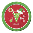 Serve your guests delicious desserts this holiday with these fun Ho Ho Ho dessert plates! The plates feature the message "Ho, ho, ho" next to a glass filled with a green, snow flake speckled drink embellished with a candy cane and Santa hat. The background is red and the border is patterned with green dots. Each package contains 8 paper plates that measure 7 inches in diameter.