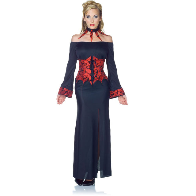 Sink your teeth into this Immortal Costume! Features a navy blue silky off the shoulder dress with long sleeves, a red waist cincher, and a choker to match. Made of 100% polyester. Hand wash only. Size is a women's small. Includes 1 costume per package.