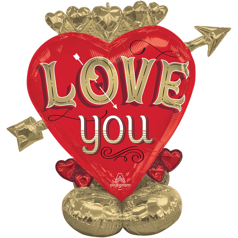 Say “I love you” in a big way with the Just My Type Heart & Arrow AirLoonz Balloon! Measuring 46" x 44", this striking free-standing balloon features a large red heart with gold lettering and an arrow detail, accented with gold and red base balloons. Perfect for Valentine’s Day, anniversaries, or romantic surprises, this AirLoonz design stands upright when filled with air—no helium needed. Inflate easily using a hand pump or electric air pump. Ships flat and uninflated. One balloon per package.