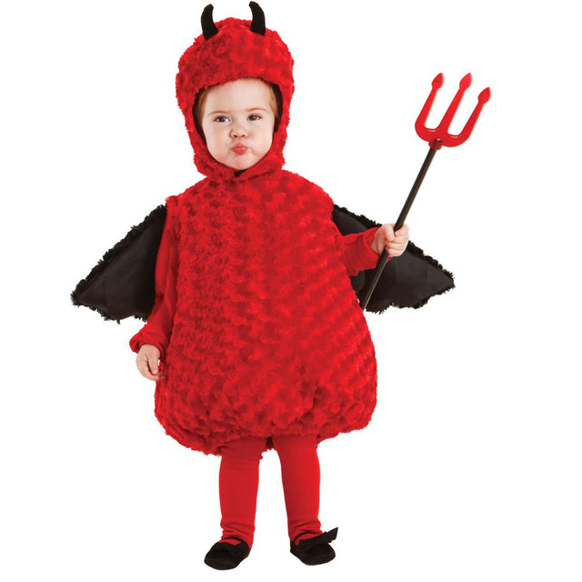 Show your little one's true side this Halloween with our Underwraps Lil Devil Costume! The costume includes a red pear shaped plush tunic with attached black wings and an attached hood with little black devil horns on top. Size boys extra large 4T-6T. Made of 100% polyester, hand wash only. Pitch fork and shoes are not included with the costume. 1 costume included per package.