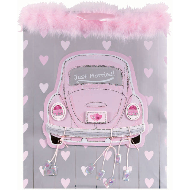 Give your wedding gift in our Love Bug Embellished Universal Gift Bag. Bag features a gray background with light pink hearts and a light pink Volts Wagon Bug driving away and the message "Just Married" in car window with light pink feathers at top and matching handle for easy caring. Measures 10.5'' x 13''. Includes 1 bag per package.