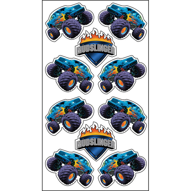 Create the perfect goody bags for your little monster truck enthusiast's birthday party using our Mudslinger Tattoos! The sheet features 8 monster truck tattoos and 2 "Mudslinger" tattoos. The tattoos are waterproof and non-toxic, making them safe and fun to use. Can be applied to either skin or hair. Not recommended for children under the age of 3 years old. 1 sheet is included per package.