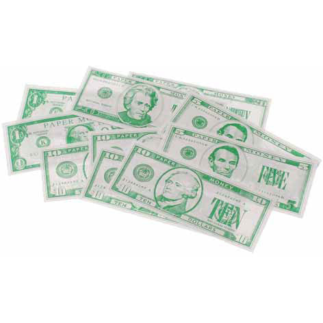 Use this fake money for poker games, pretend play, or replacements for worn out money in your board games. There are 10 bills per package. Made of paper. Size 6" L. Printed on both sides.
