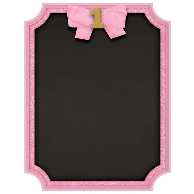 Our Premium 1st Birthday Pink Glitter Easel Sign is perfect for decorating a birthday celebration! Features a black chalkboard with a pink glitter frame with a pink bow and gold number one. Measures 9" x 7". Made of fiberboard. Includes 1 sign per package.