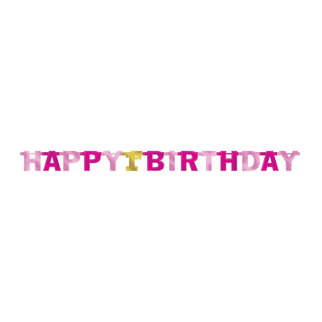 Decorate a first birthday celebration with our Premium 1st Birthday Pink Letter Banner! Features a pink and gold letter banner with the message "Happy 1st Birthday". Made of cardstock. Measures 7'. Includes 1 letter banner per package.