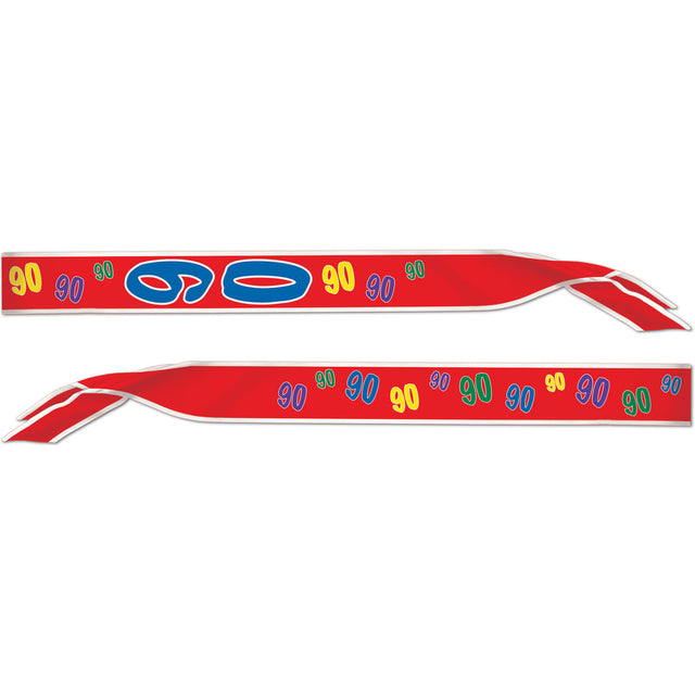 Celebrate the big 90 with this "90" Satin Sash! Featuring a red fabric sash with a white border, and colorful printed "90" all over. Sash measures 33" x 4", includes 1 sash per package. One size fits most