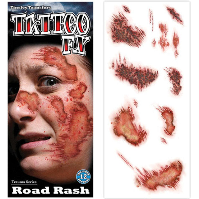 The Tinsley Tattoo FX Road Rash Temporary Tattoo is a realistic special effects accessory perfect for Halloween, cosplay, or theatrical makeup. This tattoo gives the appearance of severe scrapes and abrasions with incredible detail. Easy to apply with just water and simple to remove, it provides a long-lasting effect without the need for glue or adhesives. Safe and non-toxic, this one-size tattoo is ideal for creating authentic-looking injury effects for costumes, haunted houses, film, or stage performances.
