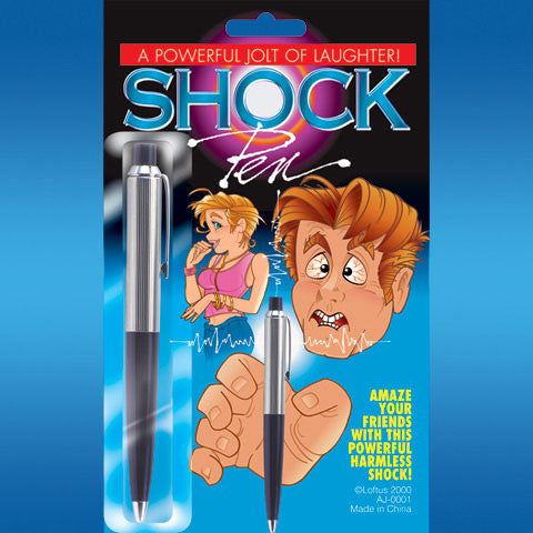 Prank your friend with this Shock Pen! Just press down to click the pen and get an electric shock! Package includes 1 shock pen. Not harmful, just shocking. The shock is 50-70 volts.