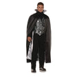 This Skull Vest Costume will be perfect for a gothic character or a vampire this Halloween! Features a silver metallic skull print vest with an attached black satin jabot, a full length black satin double sided cape with a long collar, and black pants. Hand wash only, do not iron. Size is a men's standard. Includes 1 costume per package.