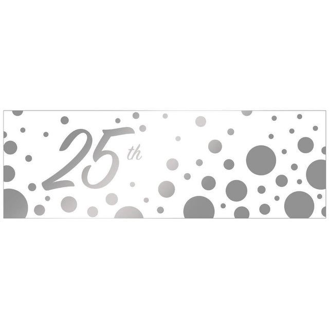 Celebrate 25 years with our Sparkle and Shine Silver 25th Anniversary Party Banner! Each banner features a silver polka dot design with the message "25th". Made of plastic. Perfect for indoor or outdoor use. Measures 20" x 60". Includes 1 banner per package.