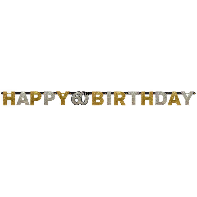 Our Sparkling Celebration 60th Birthday Prismatic Letter Banner is the perfect banner for celebrating such a great milestone! Each banner features gold, silver and black shiny finish with a sparkling "60" at the center. Measures 6.5" x 7'. One banner per package.