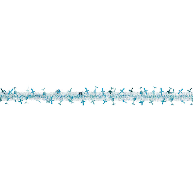 String this simple and sweet Tinsel Garland up on your wall to help celebrate a christening. Package includes 1 white tinsel garland with blue foil crosses and goblets attached. Measures 15' long.