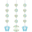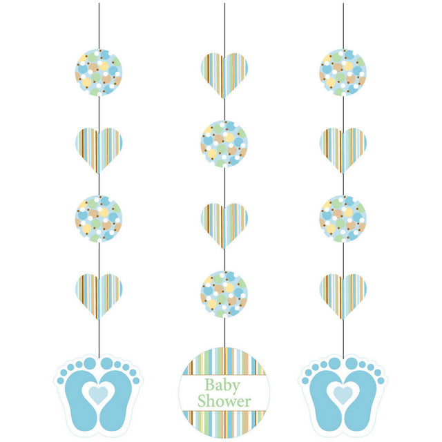 Decorate a baby shower with our Tiny Toes - Blue Cutouts! Each hanging cutout features a striped and polka dot hearts and circles with a baby toes design. Measures 36". Includes 3 decorations per package.