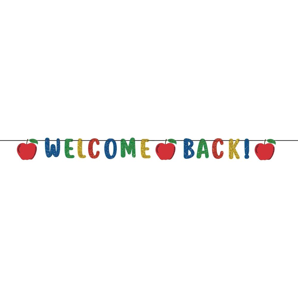Welcome your students back with our Welcome Back Letter Banner! Features a banner with primary colors, apple cutouts, and the message "Welcome Back". Made of foil cardstock. Measures 6" x 12'. Includes 1 banner per package.