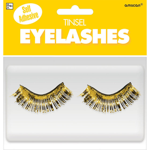Accessorize for a school game, concert, parade and more with our Yellow Tinsel Eyelashes! These fake eyelashes are composed of metallic yellow tinsel and measure 1/2" x 1". No messy glue is required, they have non-toxic self adhesive strips making them easy to apply and remove. 1 set is included per package.